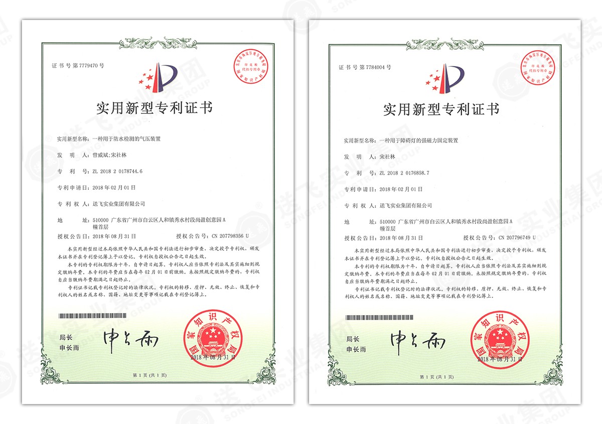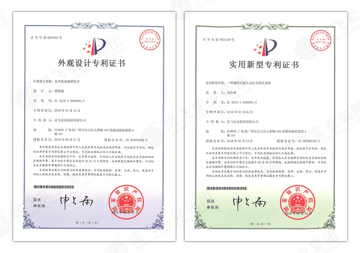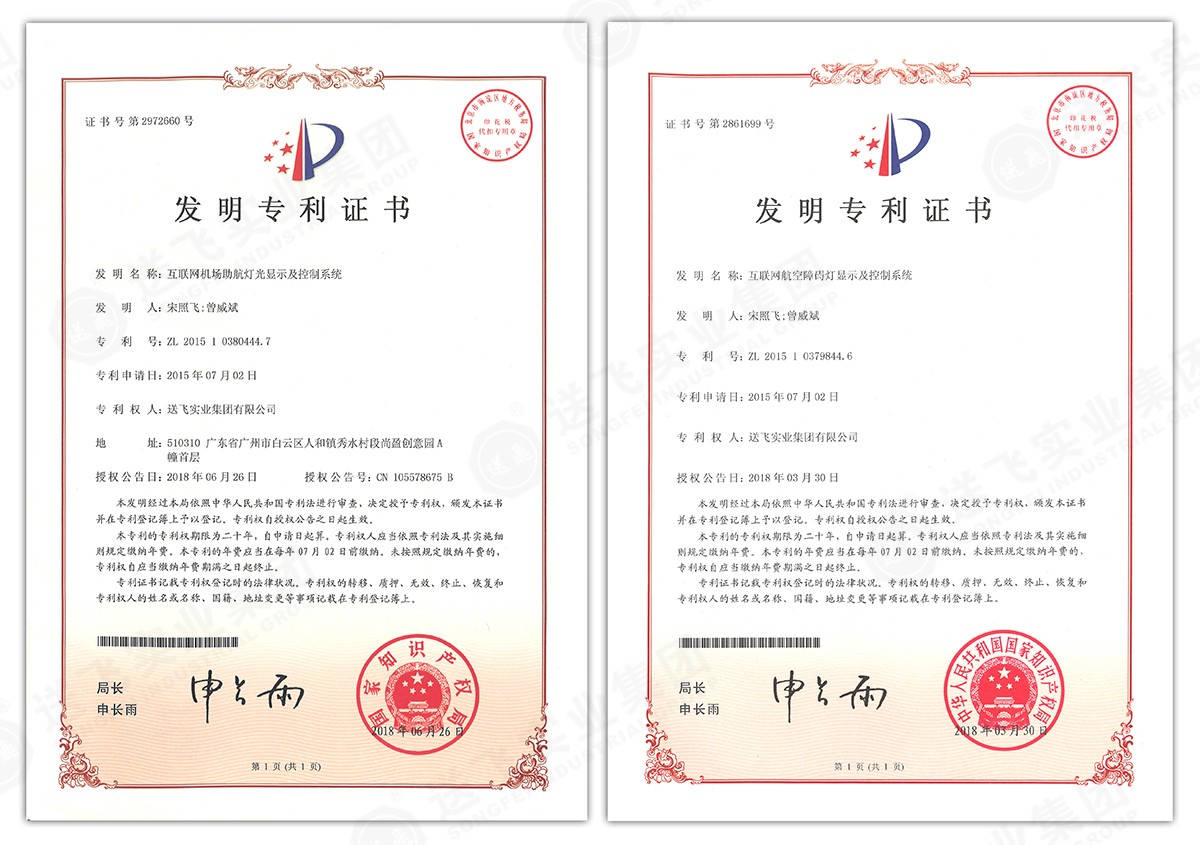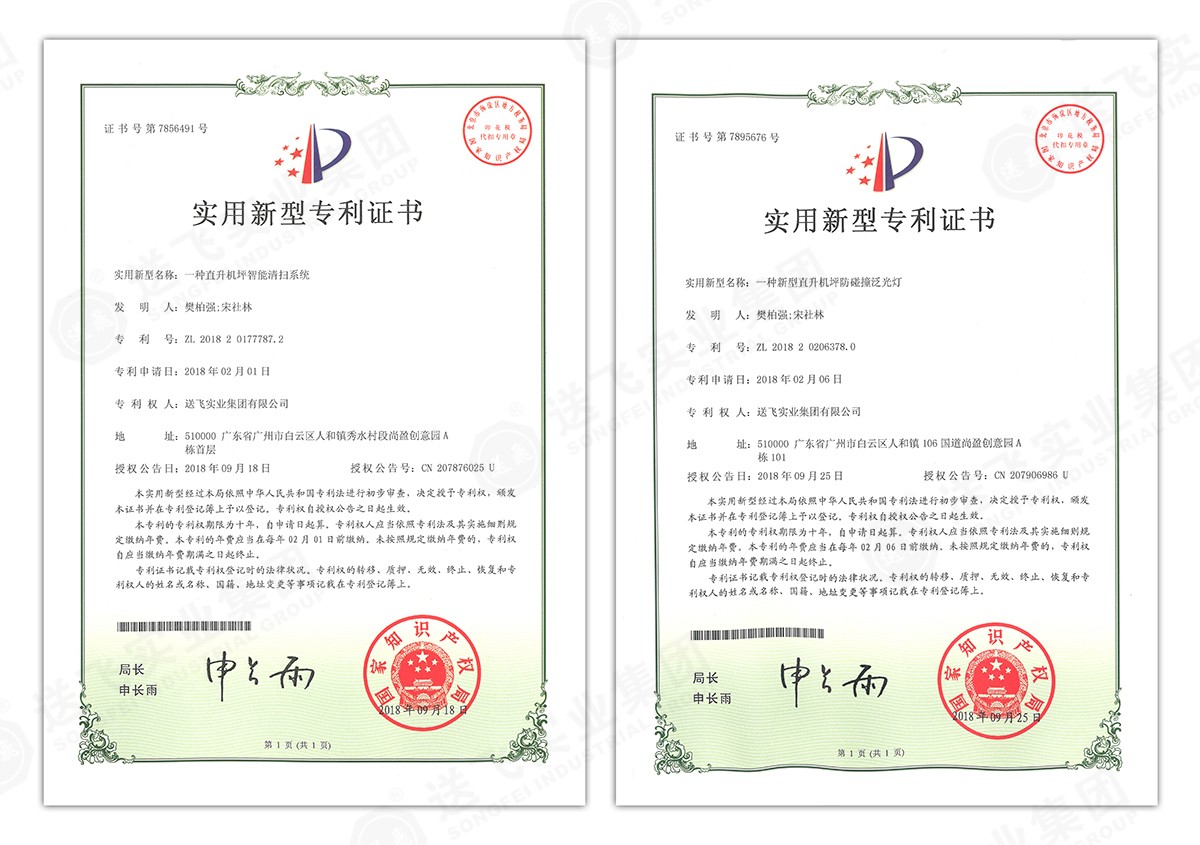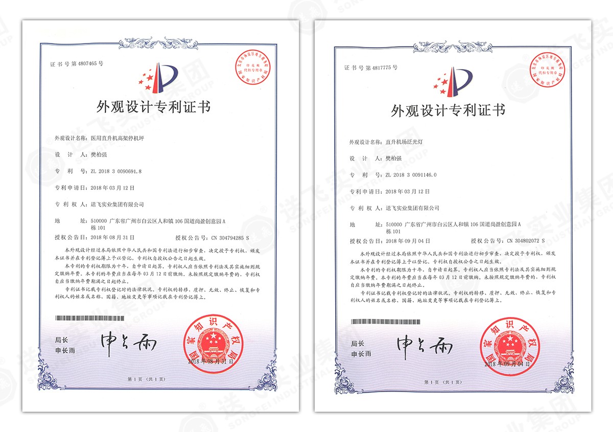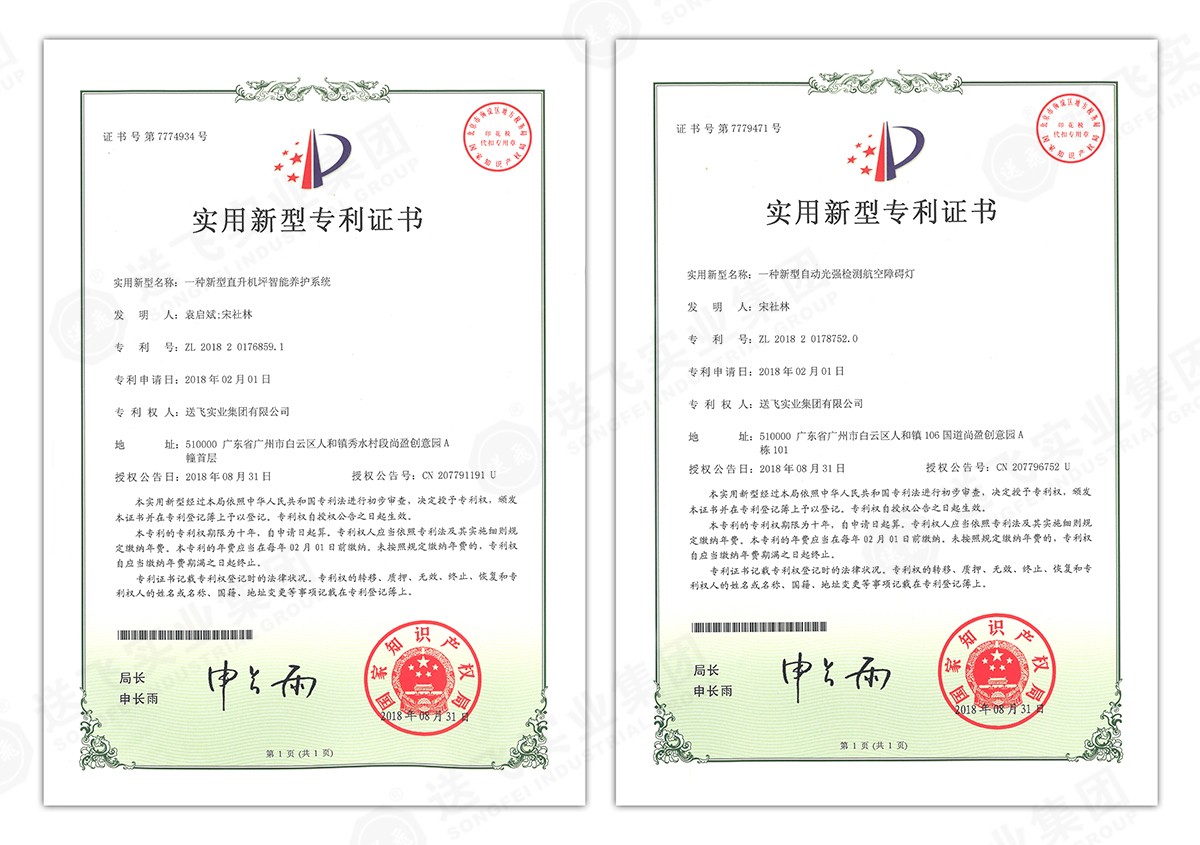 此次新下證專利有22個,其中發明專利2個,實用新型專利17個,外觀設計專利3個。專利技術涵蓋航空障礙燈、直升機坪等多項產品和業務。目前,送飛成功申請專利逾百項,填補了行業多項技術空白。
