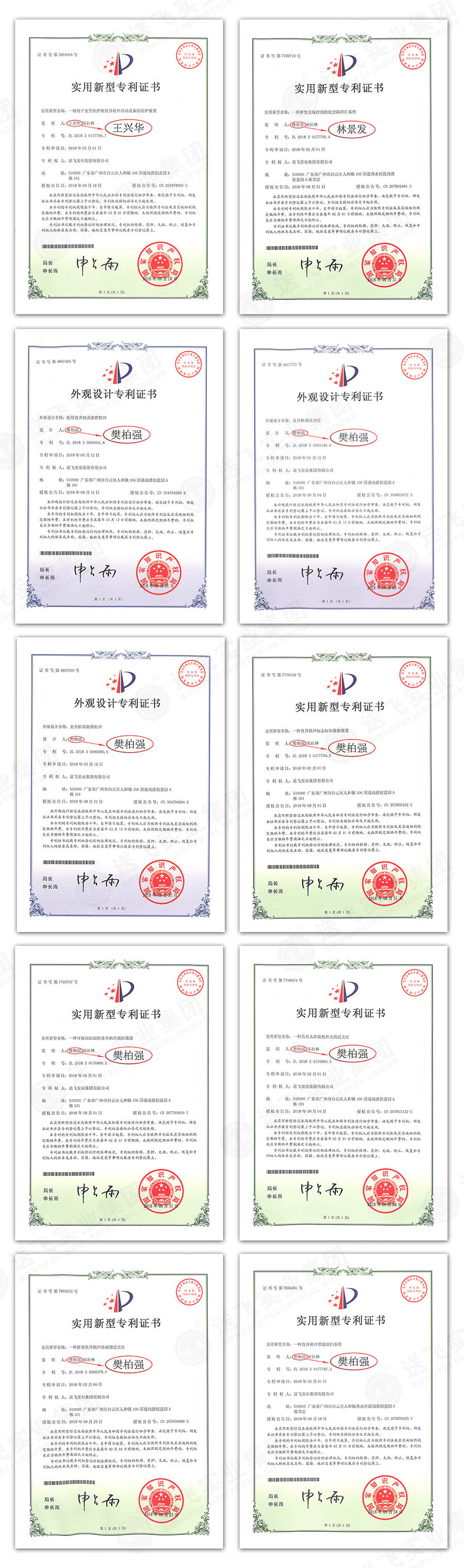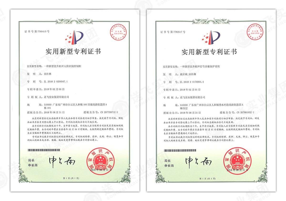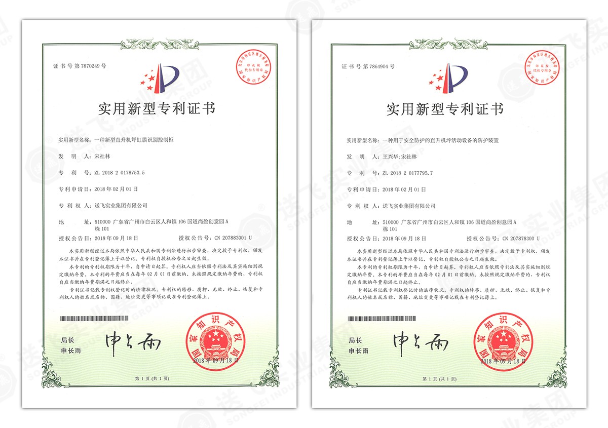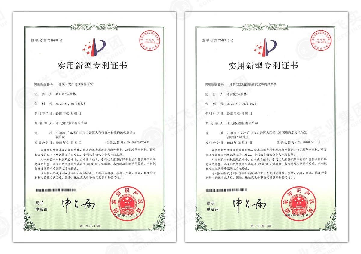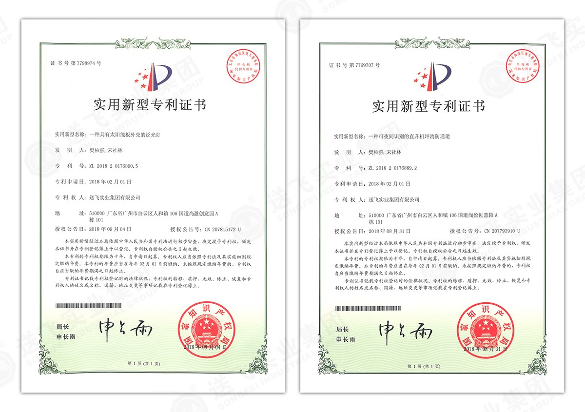 此次新下證專利有22個,其中發明專利2個,實用新型專利17個,外觀設計專利3個。專利技術涵蓋航空障礙燈、直升機坪等多項產品和業務。目前,送飛成功申請專利逾百項,填補了行業多項技術空白。